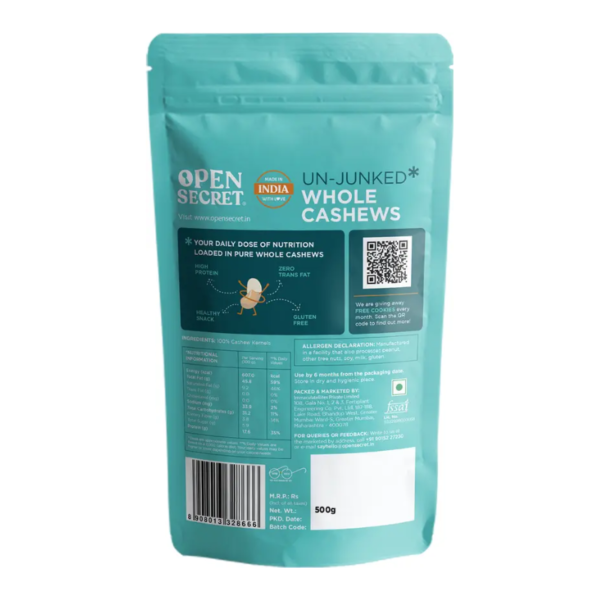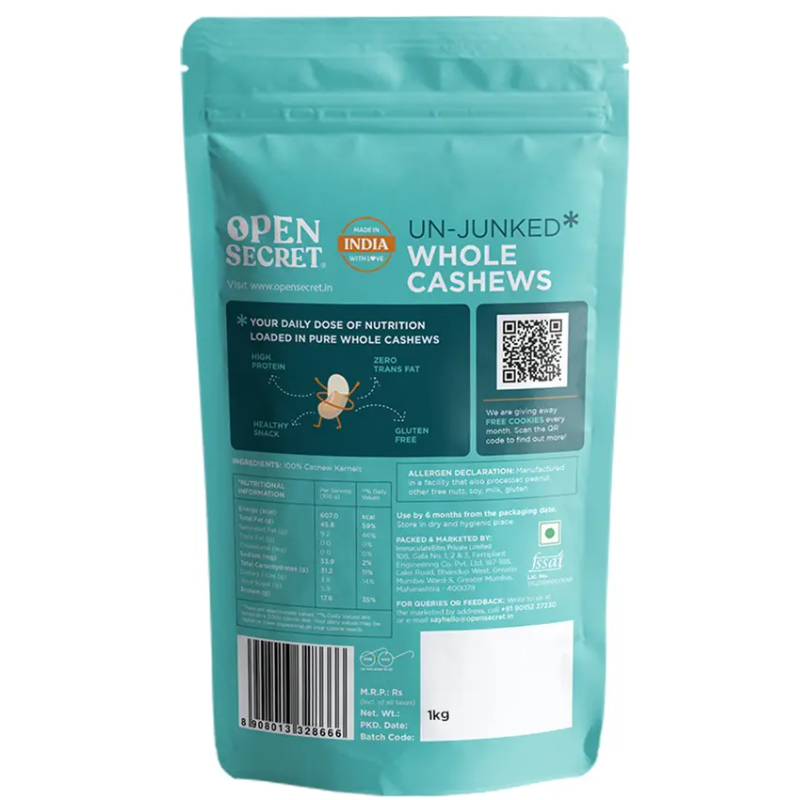 Hygienically packed to lock in freshness and quality, OPEN SECRET Premium Whole Cashews are a must-have pantry essential for health-conscious households and food lovers alike.